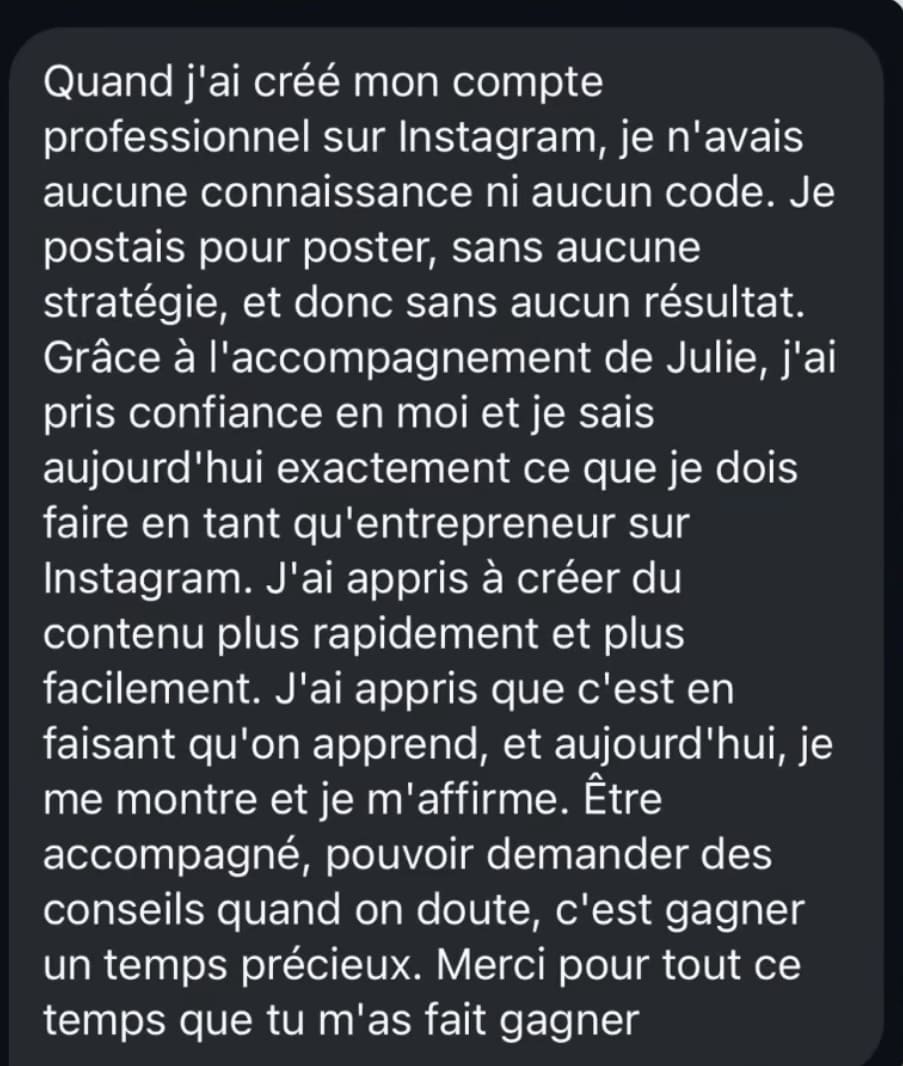 C’est normal de douter, surtout au moment de créer quelque chose de nouveau. On travaille ensemble sur la clarté de ton offre, sur ton positionnement et sur une stratégie qui te met en confiance pour parler de ton travail et le vendre sans te sentir “pushy”.